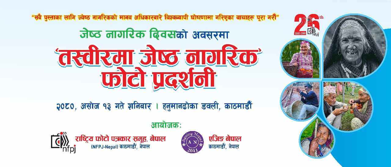 “सबै पुस्ताका लागि जेष्ठ नागरिकको मानव अधिकार बारे बिष्वब्यापी घोषणामा गरिएका बाचाहरु पुरा गरौं” भन्ने नाराका साथ राष्ट्रिय फोटोपत्रकार समूह र एजिङ नेपालको आयोजनामा नेपालका हिमाल पहाड र तराईका जेष्ठ नागरिकको तस्वीरहरु प्रदर्शनी गरिने कार्यक्रम संयोजक गणेश बिष्टले बताउनुभयो ।