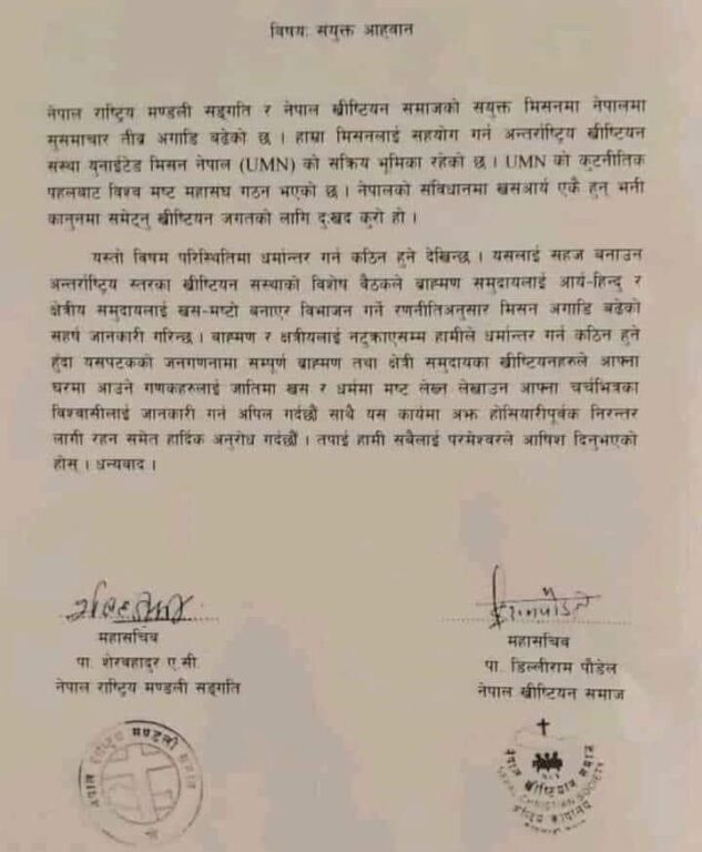 तातोखबर, काठमाडौं । नेपाल राष्ट्रिय मण्डली सङ्गति र नेपाल खीष्टियन समाजले नेपालमा बह्मण र क्षेत्रीयलाई नटुक्राए सम्म धर्मान्तरण गर्न कठिन हुने भन्दै जनगणनाको समयमा गणक हरुलाई आफु जुन जातको भएपनि जातमा खस र धर्ममा मष्ट लेखाउन अनुरोध भएको आह्वान पत्रको विषय अहिले सामाजिक संजालमा चर्चाको बिषय बनेको छ ।