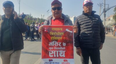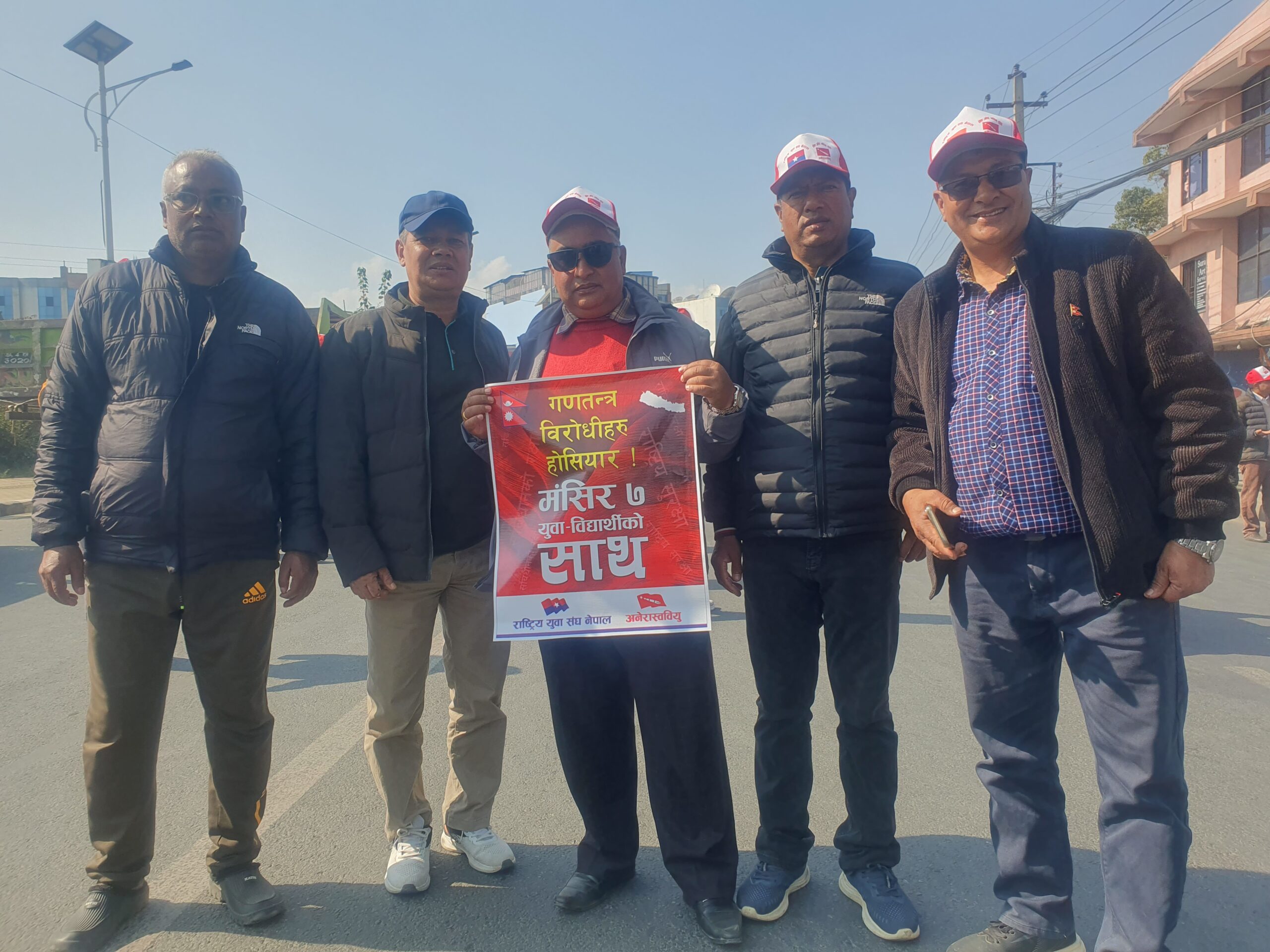 मंसिर ७, तातोखबर / आज रास्ट्रिय युवा संघ नेपालले काठमाडौँको तिनकुनेमा शक्ति प्रदर्शन गरेको छ । सरकारको काम कारबाहीको बिषयमा सरकारलाई सचेत गराउन र गणतन्त्र बिरोधि गतिबिधि बढेकाले गणतन्त्रको रक्षाका लागि आफ्नो आन्दोलन केन्द्रित रहेको युवा संघका अध्यक्ष महेश बस्नेतले जानकारी दिएका छन् ।