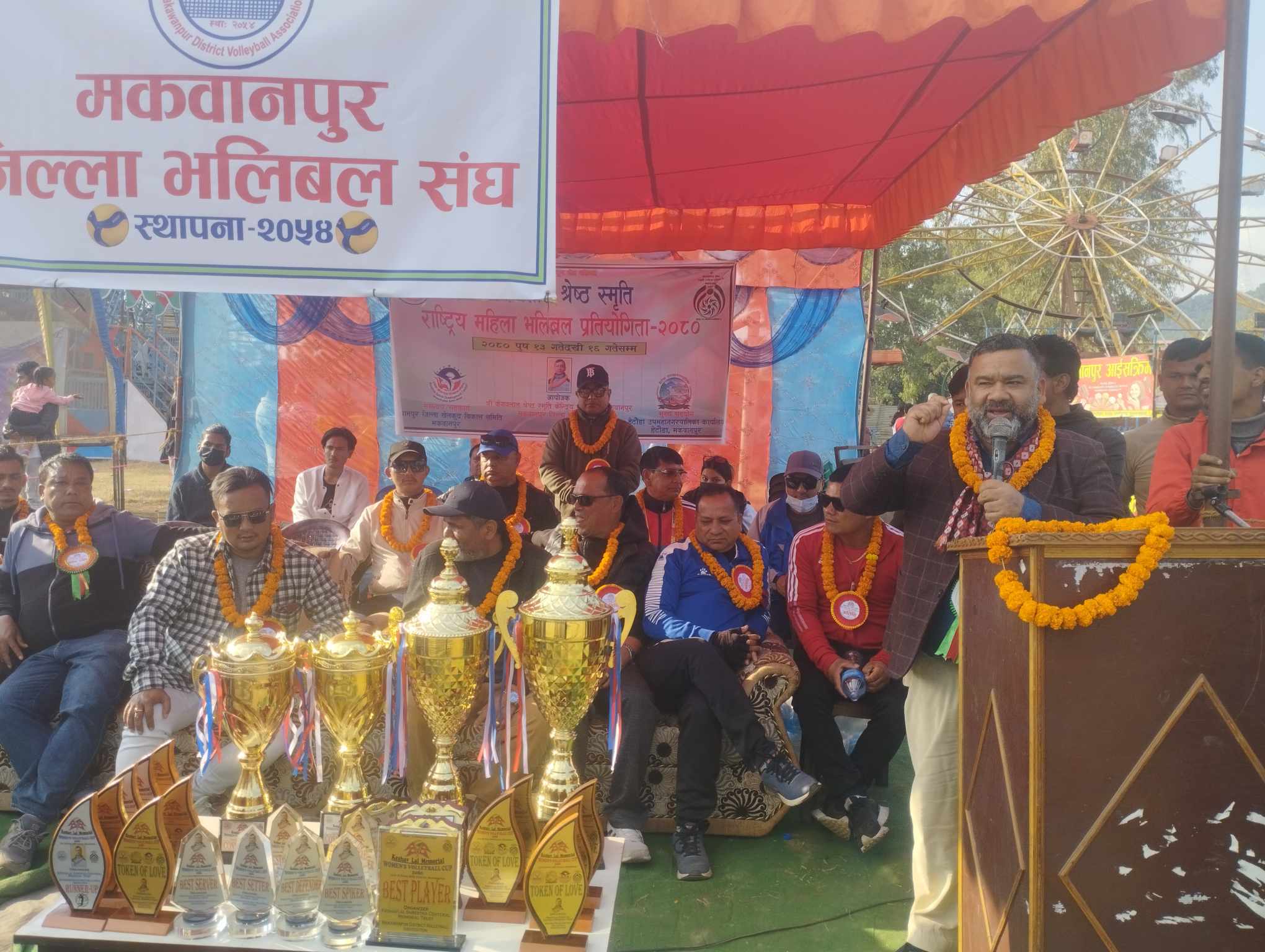 हेटौंडा – हेटौंडामा सञ्चालन भैरहेको बृहत् खेलकुद तथा व्यापार महोत्सवमा शुक्रबारबाट राष्ट्रिय महिला भलिबल प्रतियोगिता सुरु भएको छ । टिसिएन चौरमा जारी महोत्सवमा केशवलाल श्रेष्ठ स्मृति केन्द्रीय प्रतिष्ठान र मकवानपुर जिल्ला भलिबल संघको संयुक्त आयोजनामा राष्ट्रिय महिला भलिबल प्रतियोगिता सुरु भएको हो ।