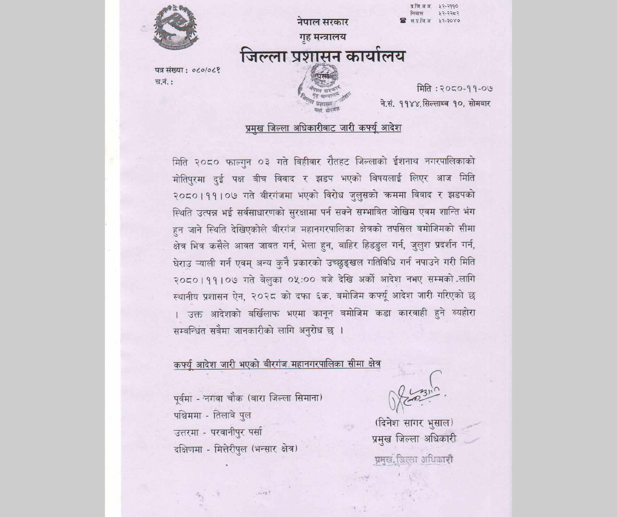 आज पर्साका सीडीओ दिनेश सागर भुसालले रौतहटमा दुई पक्षबीच विवाद र झडपको विषयलाई लिएर वीरगञ्जको विरोध जुलुसले शान्ति सुरक्षामा असर परेको भन्दै साँझ ५ बजेदेखि कर्फ्यू आदेश जारी गरेका छन् ।