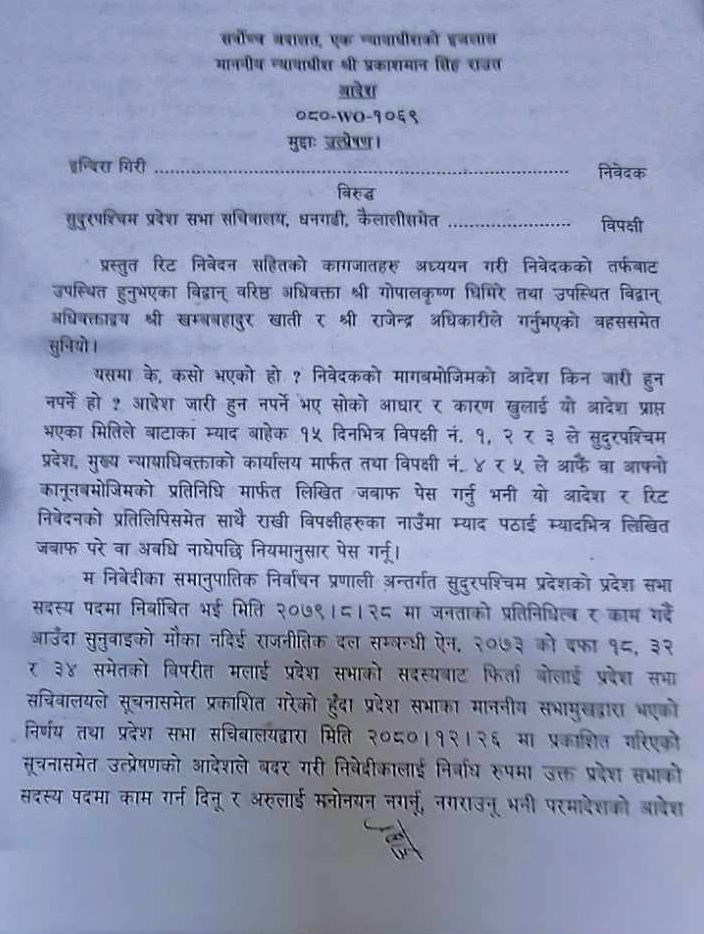तातोखबर, काठमाडौँ / सुदूरपश्चिम प्रदेशसभा सदस्य इन्दिरा गिरिलाई फिर्ता बोलाउने निर्णय कार्यान्वयन नगर्न सर्वोच्च अदालतले अन्तरिम आदेश जारी गरेको छ।