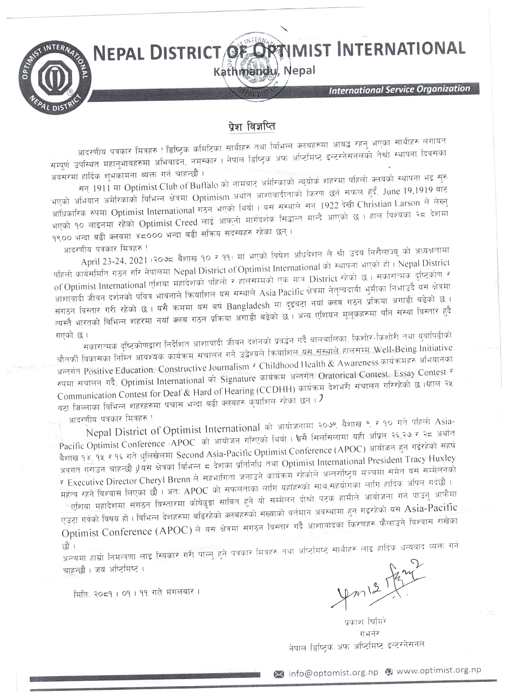 कार्यक्रममा नेपाल डिष्ट्रिक अफ अप्टिमिष्ट इन्टरनेसनलका गभर्नर प्रकाश घिमिरेले प्रेस विज्ञप्ति पढेर सुनाएका थिए । घिमिरेले अप्टिमिष्ट इन्टरनेसनलका बारेमा केहि जानकारिहरु दिँदै संस्थाले बैशाख १४, १५, र १६ गते धुलिखेलमा आयोजना गर्न लागेको पहिलो एसिया प्यासिफिक अप्टिमिष्ट इन्टरनेसनल कन्फ्रेंन्सका बारेमा बताए । उक्त कार्यक्रममा धुलिखेल घोषणापत्र जारि गरिने पनि उनले बताए ।