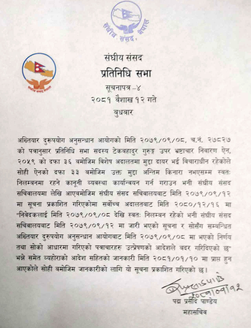 तातोखबर, काठमाडौँ / सङ्घीय संसद् सचिवालयले प्रतिनिधिसभा सदस्य टेकबहादुर गुरुङको निलम्बनसम्बन्धी निर्णय फुकुवा गरेको छ।