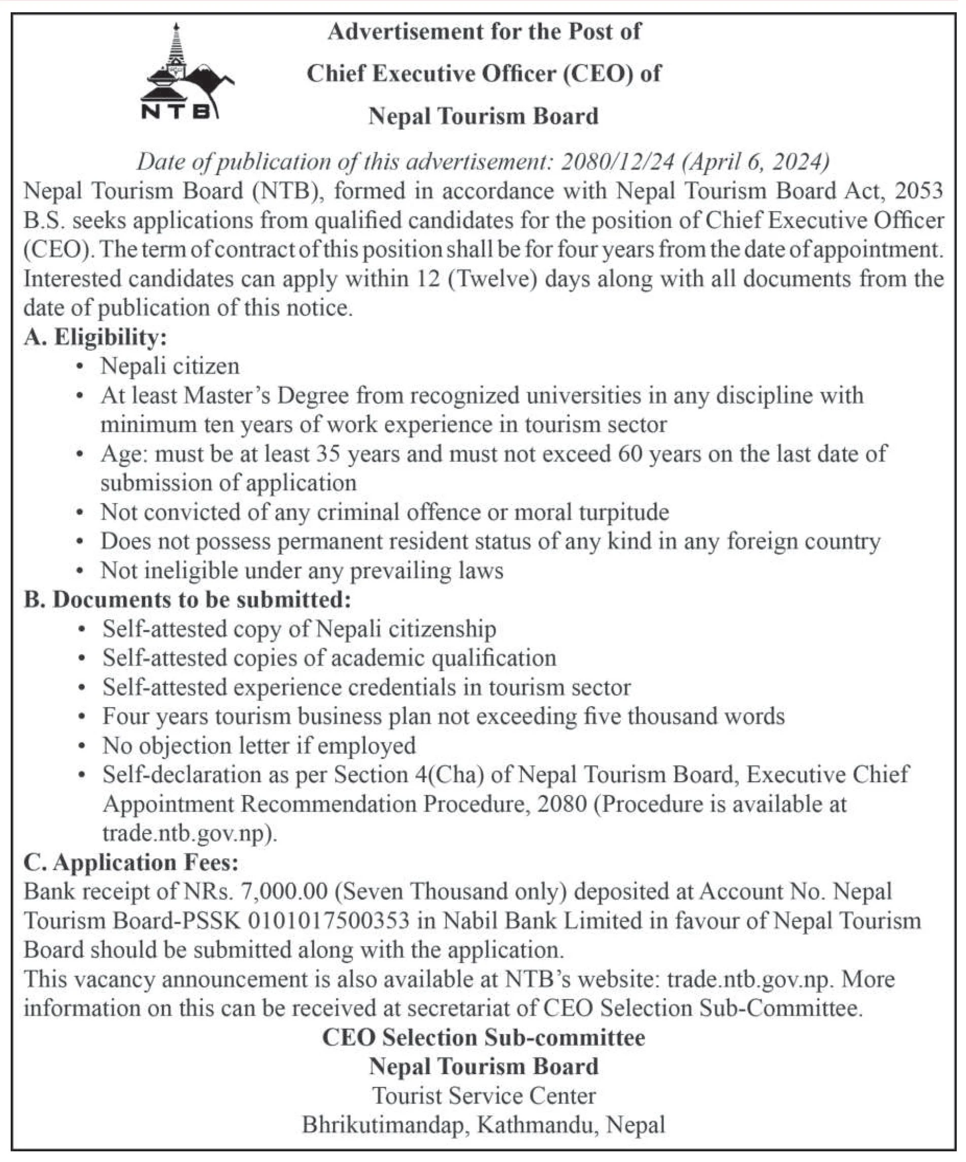 नेपाल पर्यटन बोर्डमा सीईओ पदका लागि दरखास्त आह्वान